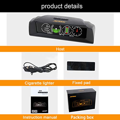 - Autool X90 inteligente Pendiente GPS medidor es un indicador de velocidad horizontal del GPS de múltiples funciones inteligentes para la conducción, es totalmente compatible con alta precisión el seguimiento de la velocidad del vehículo, el ángulo de inclinación del vehículo, cambia el ángulo de paso de vehículos, la brújula, la hora y el estado del voltaje de la batería del coche, para asegurar su conducción la seguridad.