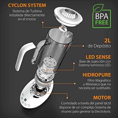- 4 FUNCIONES DE HIDROGENADO: Sistema de Electrolysis: compuesto por un complejo sistema de imanes que consiste en un campo magnético en su base para atrapar determinadas partículas y moléculas del aire; Cyclon System: Sistema de turbina instalada directamente en el motor; Hidropure: posee un Filtro Magnético y Mineraico de larga vida; Sistema de Turbina que logra la activación de las moléculas del agua. Emisión de hidrógeno - máx. 800 ppb (partes por billón). BPA Free