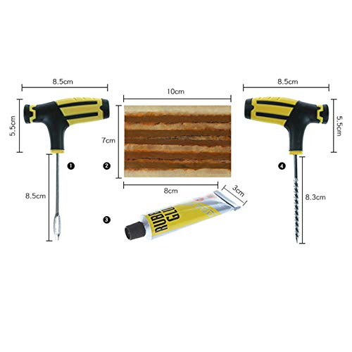 • El kit de reparación de neumáticos incluye: Tiras de reparacion * 20, Tapones de válvulas* 8,par de guantes de herramientas* 1,herramienta de taponamiento * 1, herramienta cuatro en uno * 1, perno hexagonal * 1, mango de tornillo * 1, hoja amarilla pequeña * 1, llave L * 1.