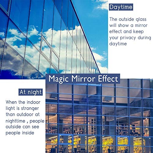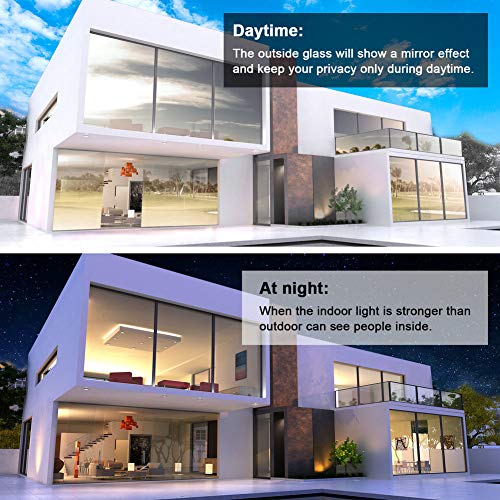 - ♣【Protección la Privacidad】Esta vinilo película puede proporcionar mejor privacidad durante el día mientras no te impide disfruta los paisajes exteriores con el efecto de un manera espejo. Pero en fuerte de luz la noche puede ser visto en el interior y en el exterior, recuerda para colgar cortinas.