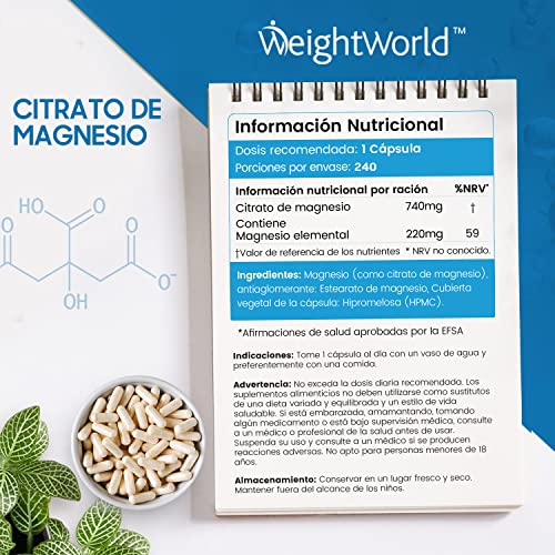 Citrato de Magnesio 740mg, 240 Cápsulas Veganas - 220mg de Magnesio Puro...