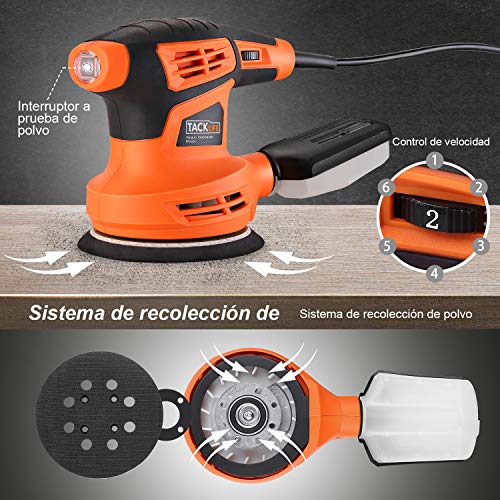 - ▶ 【Placa Base Giratoria de 360 ° y 6 Velocidades Variables】 La placa base de lijado giratoria de 360 ° de la lijadora excéntrica crea una superficie uniforme proporcionando un acabado más fino con una eliminación lenta pero uniforme del material, preparando una superficie antes y después de pintar; 6 velocidades variables para que pueda elegir la velocidad más adecuada desde el lijado hasta el pulido