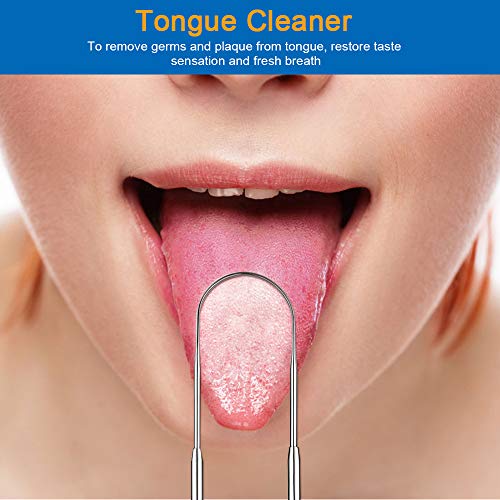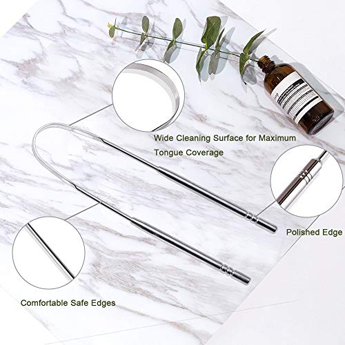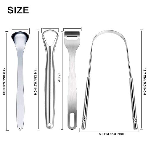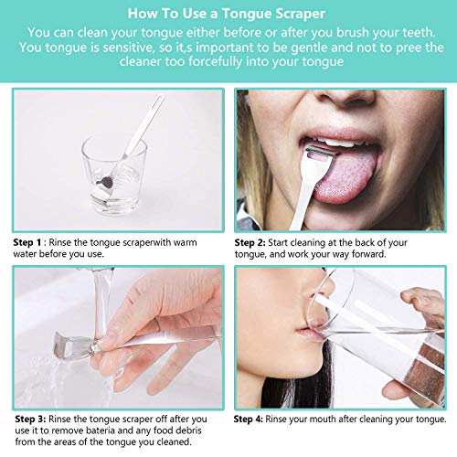 - El paquete incluye: Recibirá 4 piezas de raspadores de lengua de acero inoxidable, dos de ellos en forma de U y más grandes, y los otros dos son huecos y más pequeños. Limpie toda la lengua con el raspador más grande y limpie algunas áreas difíciles con las pequeñas.