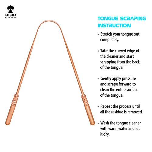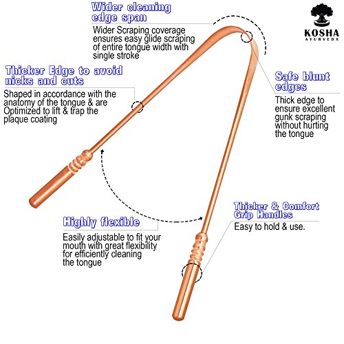 - ☺ BORDES LIMPIADORES MÁS AMPLIOS: El limpiador de lengua de cobre Kosha Ayurveda tiene un borde de raspado más amplio, lo que le permite limpiar toda la superficie de la lengua en una sola pasada. No queda ningún área sin tocar, lo que permite una limpieza más saludable de toda la superficie de la lengua.