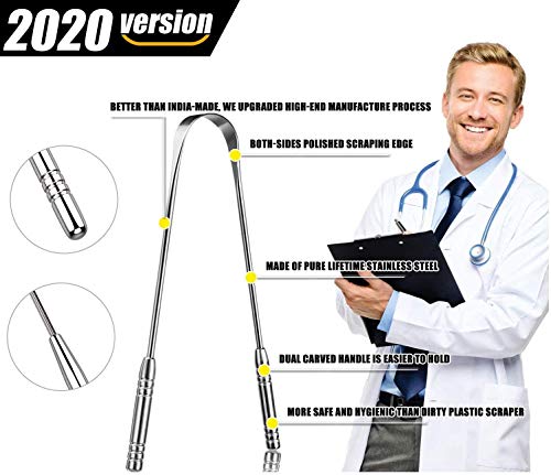 - El peso preciso y el diseño de 2 asas superarán el efecto de "GAG" mucho mejor que los raspadores de plástico o metal, por lo que podrás limpiar más de nuevo en tu lengua (donde los desechos se acechan).