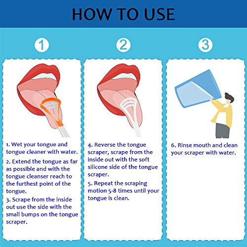 - Fácil de usar: coloque el raspador de lengua en su lengua para encontrar el lugar adecuado para su boca, y raspe su lengua con suavidad, el mango antideslizante proporciona un agarre fuerte, no es fácil deslizarse o lastimarse
