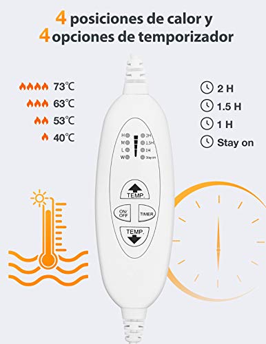 - 【Buena protección de sobrecalentamiento】El producto dispone de certificaciones de CE GS y Öko-Tex Standard, que confirman la seguridad de su compra; Cuenta con la función de 1 o 2 horas de apagado automático, que le proporciona una protección más segura; utilizamos aislamiento de PVC que envuelva el cable calefactor, que puede ofrecerle una seguridad más alta que el cable calefactor ordinario. El cableado de 240 cm de largo te permite un movimiento más libre y conveniente