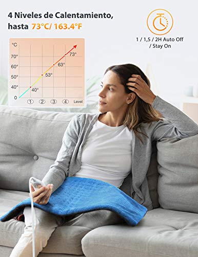 - 4 Niveles de Calentamiento y 4 Opciones de Temporización: La manta eléctrica eléctrica presenta 4 configuraciones de calor, opción H-M-L-W (73/63/53/40 °C) y cuatro funciones de temporización (1/ 1.5/ 2 horas de apagado automático / opción "Stay on" ) para adaptarse a sus diferentes necesidades y obtener una experiencia de terapia de calor más cómoda.Nota: De acuerdo con el IEC 60335-2-17, cuando se establece en la función "stay on", solo tiene la opción "W" (40 ℃) para su seguridad.