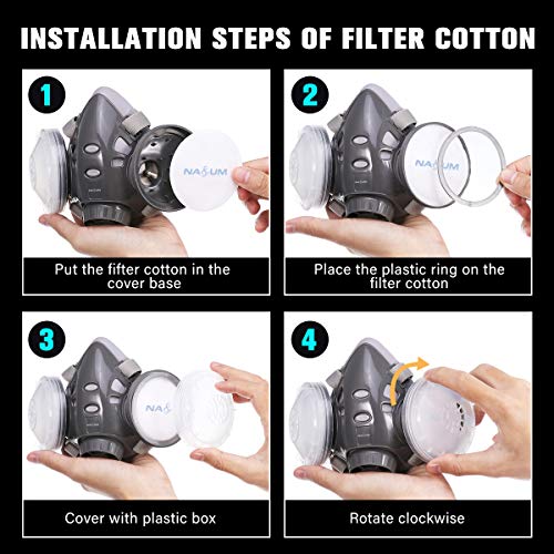 - ▼ DISEÑO ERGONÓMICO ▼: La facial cubierta de respiración NASUM está diseñada con una forma convexa tradicional para ajustar el sello de acuerdo con la cara del usuario. La media facial cubierta ofrece un amplio campo de visión y está perfectamente integrada con las gafas incluidas. Hay una facial cubierta en la caja, una facial cubierta, dos pares de filtros de algodón, un par de tapones para los oídos.