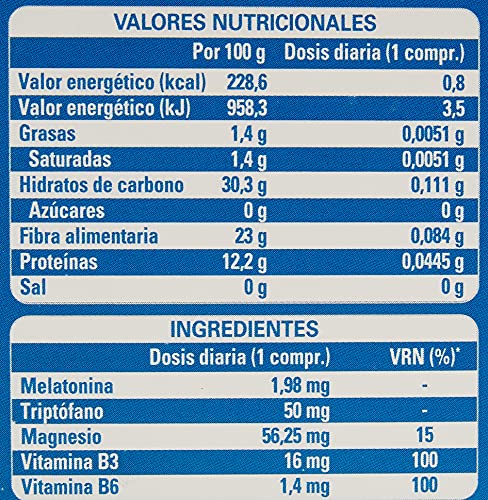 - Complemento alimenticio con melatonina (1,98 mg), triptófano, magnesio y vitaminas B3 y B6. Sin azúcares, sin gluten, sin lactosa y apto para veganos