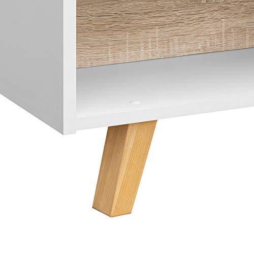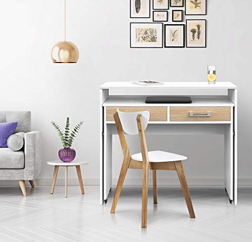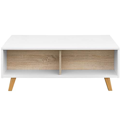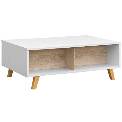 - ESTILO: la combinación de color madera roble con el blanco lacado crea una encantadora mesa baja auxiliar. Sencillez y minimalismo en esta luminosa mesita-escritorio moderna que se hará con un hueco en tu salón o comedor sin dificultad.