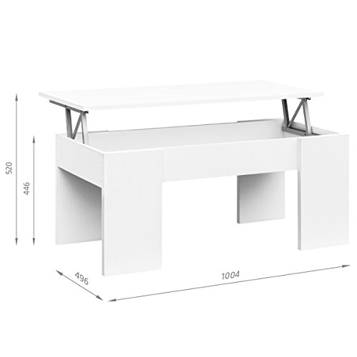 - MATERIAL y DIMENSIONES: Mesa de centro de aglomerado de alta calidad, las medidas son 43 cm (altura) x 100 cm (ancho) x 50 cm (fondo) con la mesa cerrada, llegando a 55 cm de altura con la encimera abierta. Suave mecanismo de elevación metálico y resistente al peso, queda totalmente oculto al bajar el tablero