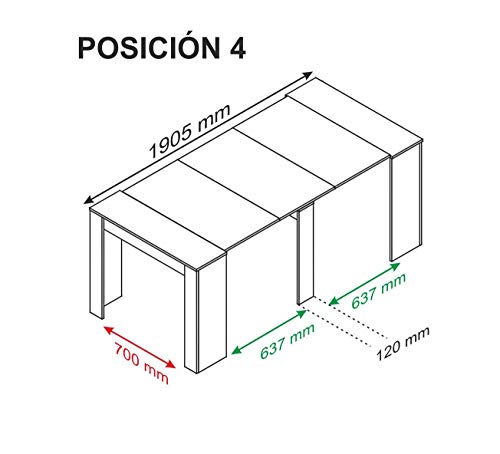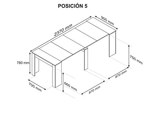- Medidas de la consola cerrada: 90x45x76 cm. Longitud variable: con una extensión 97 cm, con dos extensiones 149 cm, con 3 ext. 201 cm, con 4 ext. 253 cm, con 5 ext. 305 cm. Acoge hasta 14 personas. La superficie es lisa