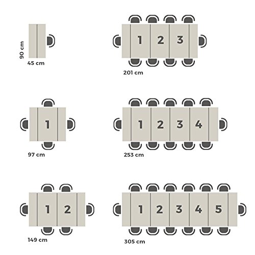 - Medidas de la consola cerrada: 90x45x76 cm. Longitud variable: con una extensión 97 cm, con dos extensiones 149 cm, con 3 ext. 201 cm, con 4 ext. 253 cm, con 5 ext. 305 cm. Acoge hasta 14 personas. La superficie es rugosa