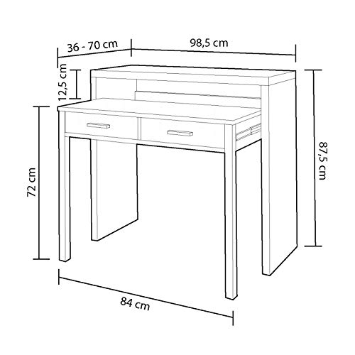 - Las medidas son: 98,5 cm (ancho) x 87,5 cm (alto) x 36-66 cm (fondo), la mesa consola escritorio es extensible dando la oportunidad de ahorrar espacio, se abre y se cierra cuando necesites, una mesa ideal para cualquier tipo de casa, espacio y/o necesidades