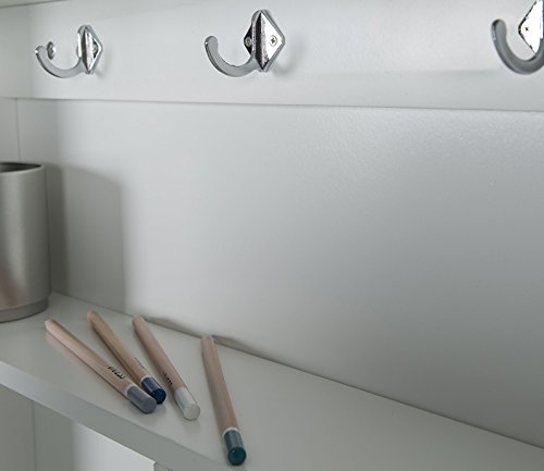 - Este tipo de material tiene una superficie no porosa y muy resistente; por lo tanto, es un mueble fácil y rápido de limpiar con un paño húmedo; requiere montaje (incluye instrucciones y herrajes); no incluye los objetos de decoración y accesorios (cestas no incluidas).