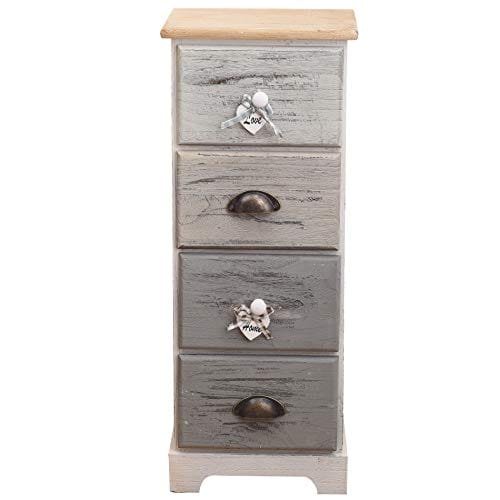 - DETAILLES TÉCNICOS: Medidas totales: A 59,5 cm x AN 30 cm x FON 25 cm - Medidas Cajones (3): A 14,7 cm x AN 23 cm x FON 18,8 cm - Color: Blanco shabby, gris, azul - Material: Paulownia, madera contrachapada - Cod. RE6081