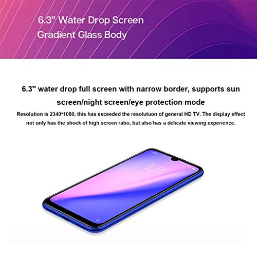 - Waterdrop Pantalla, nueva visión impresionante: la juventud es esperanzadora y prometedora. La muesca de las gotas de agua avanzadas condensa la cámara en un espacio pequeño, como una gota, que está a punto de gotear con una posibilidad ilimitada. La nueva e impresionante visión ofrece una impresionante relación pantalla / cuerpo, que le da al frente una apariencia elegante y sin precedentes. (Pantalla Waterdrop 6.1 '', 19: 9, relación de pantalla del 90%)