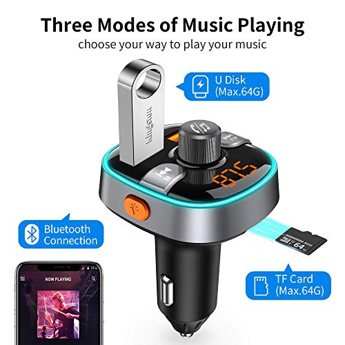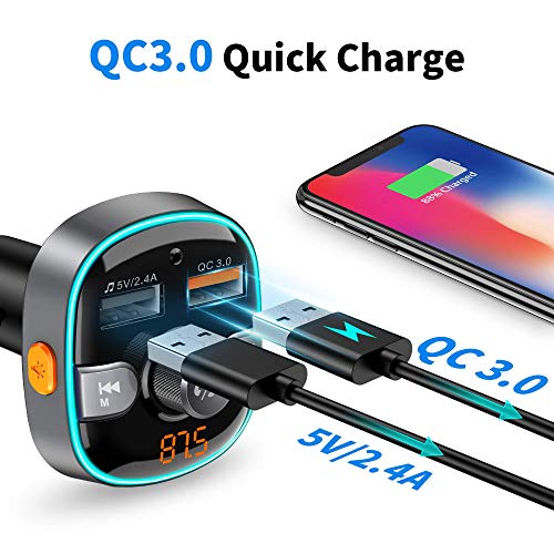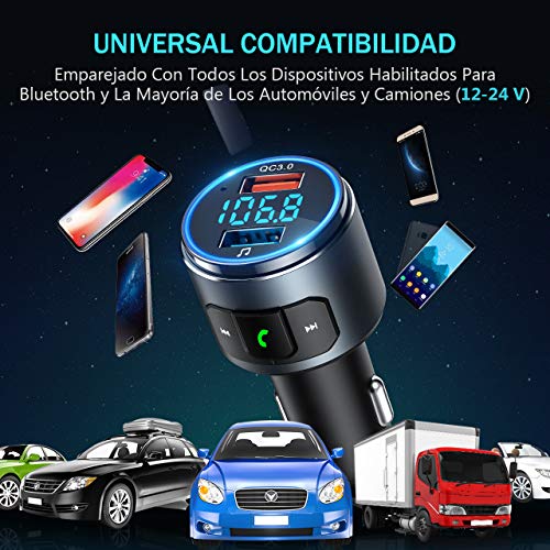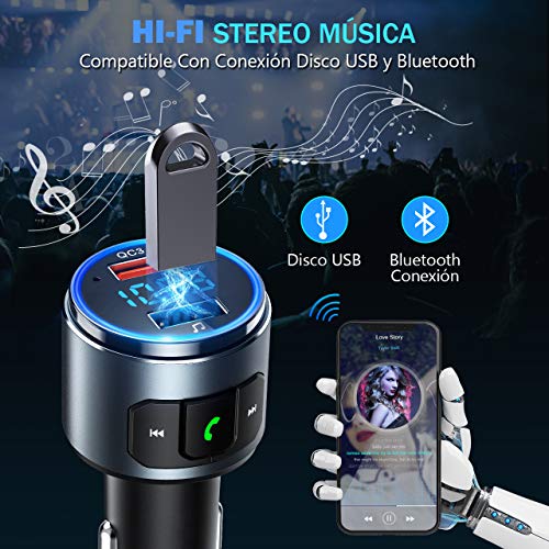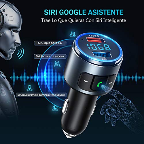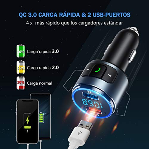 Nuevo Versión Transmisor FM Manos Libres Bluetooth Coche con 2 USB 5V 2.4A&QC 3.0 Carga Rápida Cargador Coche, 7 Colores Reproductor MP3 Coche Soporte USB Flash Drive &Tarjeta TF 64G, SIRI/Google
