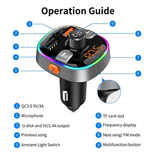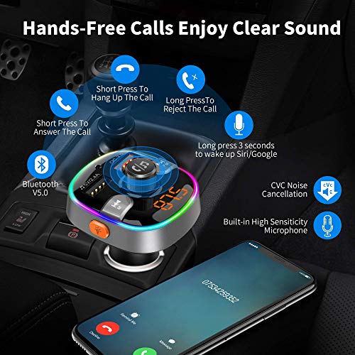 Upgrade Transmisor FM Bluetooth 5.0 Coche Manos Libres con 7 Colores Luz, Reproductor MP3 Coche Carga Rapida QC3.0, 2 USB 5V/3A&2.4A Inalámbrico Kit de Coche Soporte Tarjeta TF 32 G, AUX, SIRI/Google