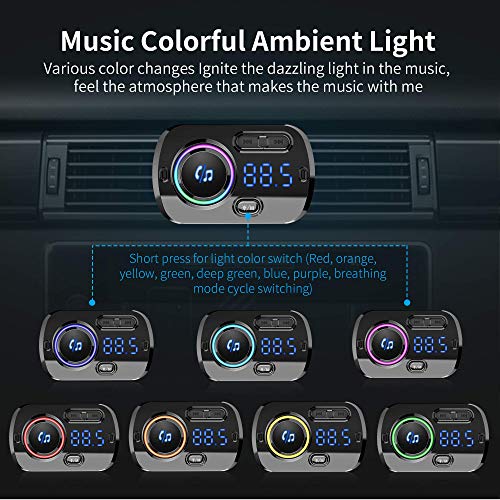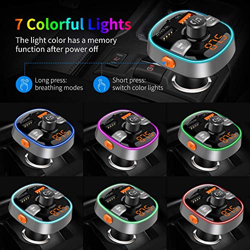 Upgrade Transmisor FM Bluetooth 5.0 Coche Manos Libres con 7 Colores Luz, Reproductor MP3 Coche Carga Rapida QC3.0, 2 USB 5V/3A&2.4A Inalámbrico Kit de Coche...