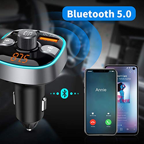 Transmisor FM Bluetooth 5.0 para Coche, [Luz LED Anillo] QC3.0 VicTsing Mini Transmisor Bluetooth Manos Libres con Siri Asistente, Reproductor MP3 Coche, Adaptador de Radio Hi-Fi Música Spotify