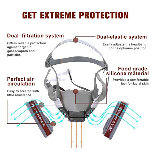 - 1.☛ MATERIALES DE SEGURIDAD☚ La facial cubierta está hecha de boca de goma, que ofrece comodidad durante su trabajo. También hay una banda elástica y una válvula de refrigerante de alta calidad, lo que le permite respirar serenamente. NASUM facial cubierta profesional usaun sistema de filtración dual para bloquear efectivamente el 96% de los vapores / gases orgánicos, polen, polvo y otras partículas en el aire. ¡Consigue el aparato facial cubierta para tu trabajo!