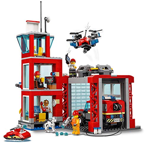 LEGO City Fire – Parque de Bomberos, estación de juguete para construir, incluye camión, moto acuática y dron (60215)