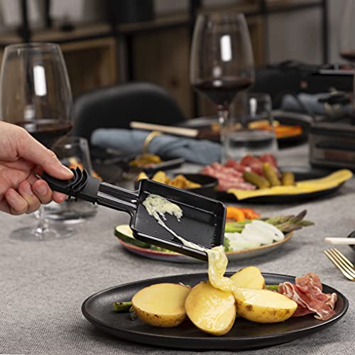 - La raclette es una forma tradicional suiza de cocinar juntos que permite a las familias y amigos disfrutar de una tarde agradable cocinando en una mesa. Óptimo para los fines de semana, para fiestas o celebraciones. No pases horas y horas en la cocina. Deja que cada uno prepare su plato favorito mientras estáis sentados a la mesa. La parrilla está fabricada con aluminio fundido de alta calidad y tiene un lado plano y un lado de parrilla