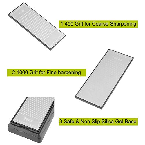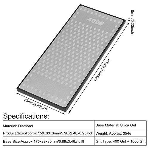 - Material: diamante; Material base: gel de sílice; Tamaño: aprox. 200 × 70 × 6 mm / 7.87 × 2.75 × 0.23 pulgadas; Tipo de grano: grano 400 + grano 1000; Peso aproximado. 354 g