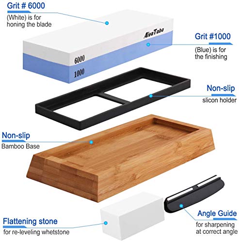 - ✅ El KIT DE PIEDRA DE AFILAR MÁS COMPLETO - El contenido del paquete del afilador de cuchillos viene con 1x Piedra de Afilar de corindón blanco de doble cara (1000 / 6000), 1x Almohadilla de Silicona, y 1x Base de Bambú para sujetar la piedra, 1x Guía de Ángulo de afilador cuchillos, 1x Manual de instrucciones detallado.
