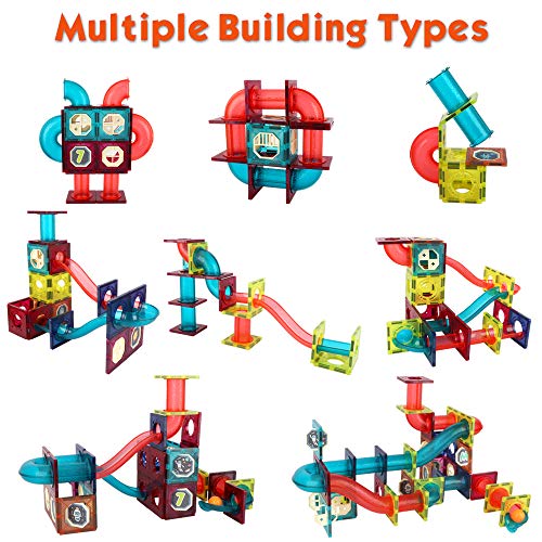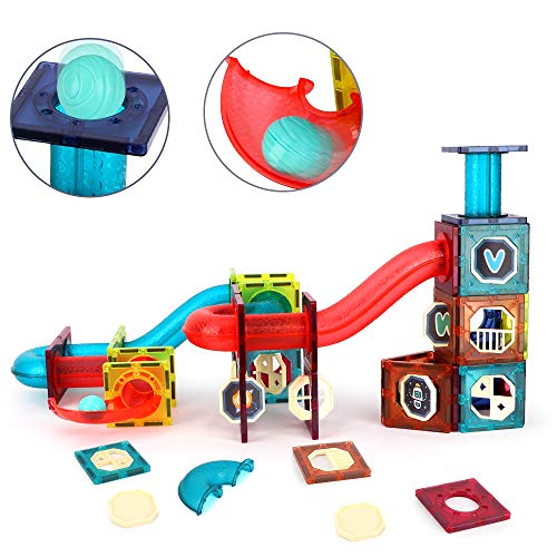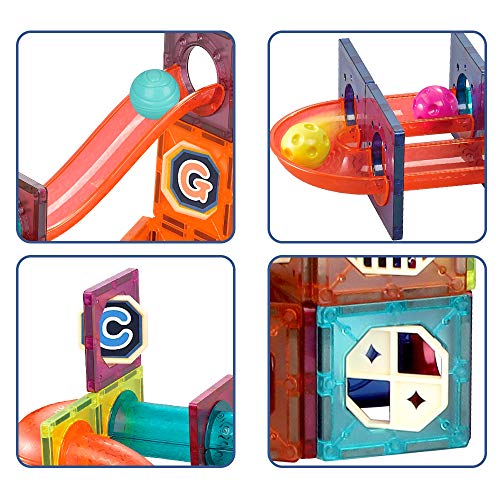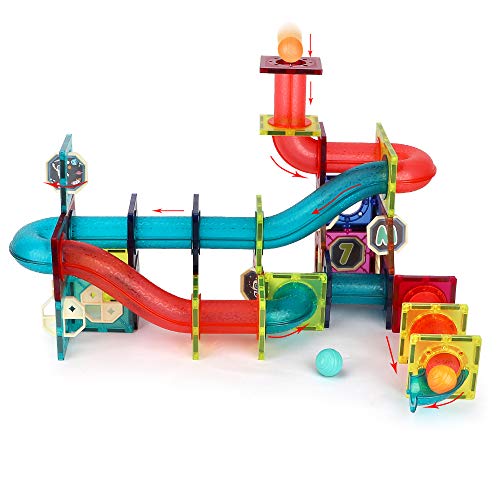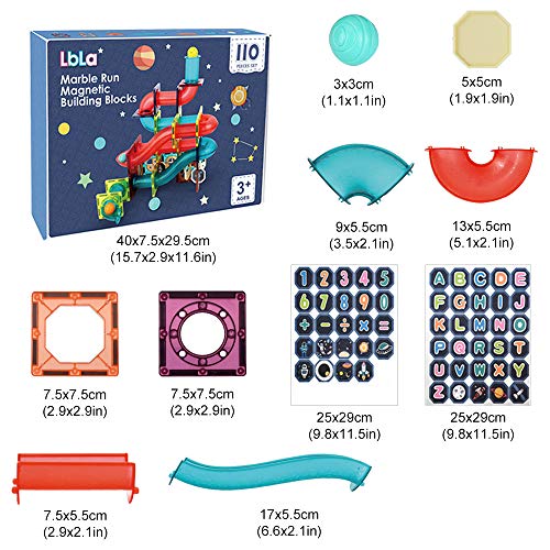- 【Juguete Marble Run】 El total es de 110 piezas, que incluye piezas cuadradas magnéticas de colores, piezas hexagonales, rampas de bolas, piezas giratorias y bolas de actividad giratoria. Además, el juego es con números y pegatinas del alfabeto y manual.