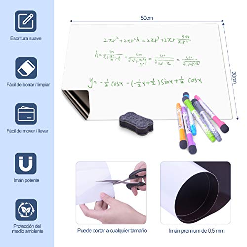 - 【Fácil de transportar y cortar】 - La pizarra magnética se puede doblar y enrollar para facilitar su transporte y ahorrar espacio. Además, el tamaño A3+ (50*30 cm) es suficiente para grabar el mensaje, también puede cortar la pizarra con las tijeras o la hoja al tamaño y la forma que necesite.