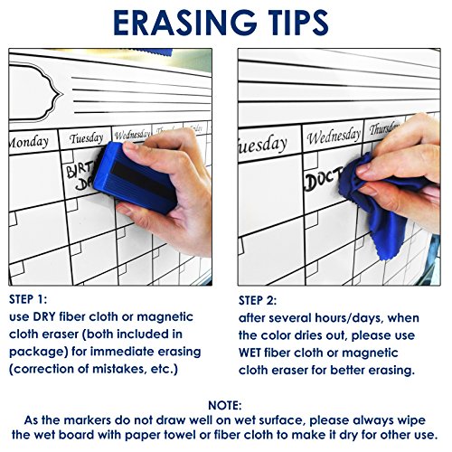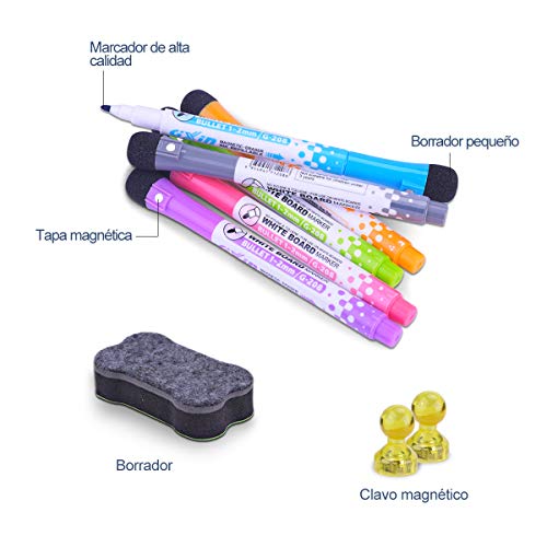 - 10 ACCESORIOS EXTRA - el set incluye 4 rotuladores de colores magnéticos para organizar y decorar tu calendario en la pizarra. Marca las fechas importantes con 4 imanes de colores. Usa el borrador magnético para borrar rápidamente y la mopa de fibra para secar el color.