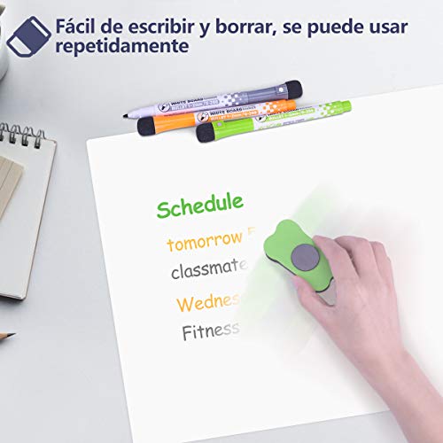 - Goma de Borrar Incorporados -Incluimos 4 rotuladores de colores que se borran en seco con cada pizarra. Cada rotulador tiene un imán y una goma de borrar incorporados, Tambien puede borrar la mancha con borradores de pizarras, una paña o servilleta. Después de unos días, pues usted hace falta un detergente para limpiar la mancha.