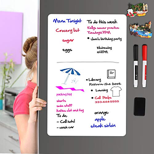 - 【Pizarra de refrigerador multiusos】Te ayuda a registrar tu lista de compras,shopping list,de tareas,calendarios semanales, citas, menú, notas e incluso utilizarla como pizarra para los niños, ideal para su aviso de mensajes a domicilio y boletín de la oficina, muy útil para mantener el hogar organizado y el control del horario del trabajo.