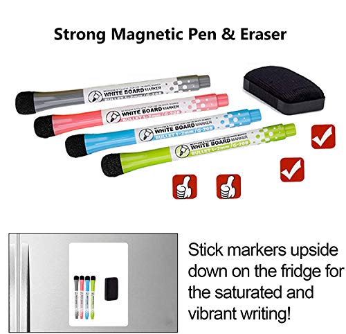 - ♣【4 Rotuladores Colores】Incluimos 4 rotuladores de colores con un imán y una goma de borrar incorporados, simplemente tiene que pegarlo al lado de la pizarra para tener un acceso rápido y fácil. ¡Nunca ha sido más fácil utilizar un código de colores para los alimentos o las tareas!