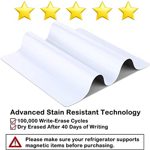 - 【Material Magnético】 - La pizarra magnética está hecha de sustrato de hierro y su superficie está hecha de material PET. Tiene alta calidad y protección ambiental, superficie lisa y mejor efecto de escritura que la pizarra tradicional. Fácil de instalar en cualquier superficie metálica, nevera, estufa, lavavajillas, etc. Quedará firmemente fijada al frigorífico gracias a sus suaves imanes potentes.