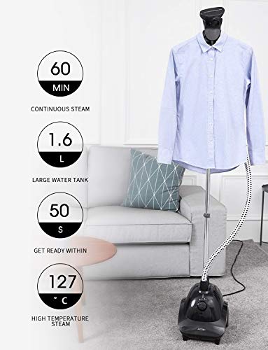 - Seguridad & Facil - Solo rellenar el tanque de agua con 1600ml suficientes, después rápido precalentamiento permite vaporizar la ropa. Apagado automático cuando hace demasiado calor o falta de agua. Percha giratoria de 360°, varillas de aluminio duraderas y anticorrosivas con 4 postes telescópicos ajustables que hacen más conveniente y fácil el planchado y almacenamiento de la ropa.