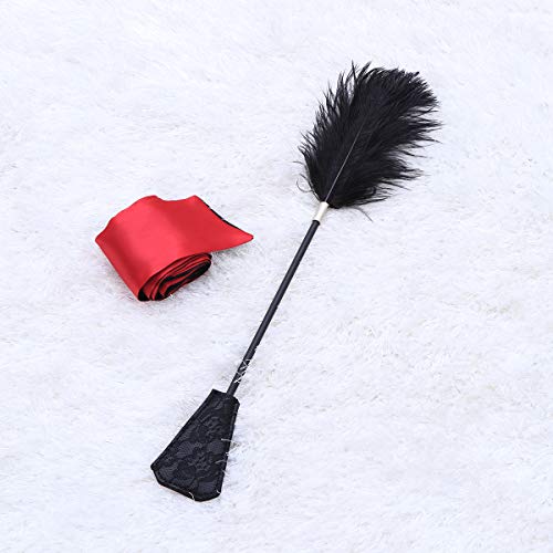 LUOEM 2 en 1 exquisita pluma de avestruz tictac y coquetear azote de cuero azotando a mano con satén con los ojos vendados máscara para los hombres mujeres