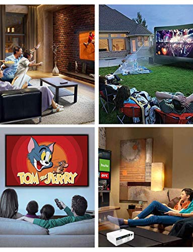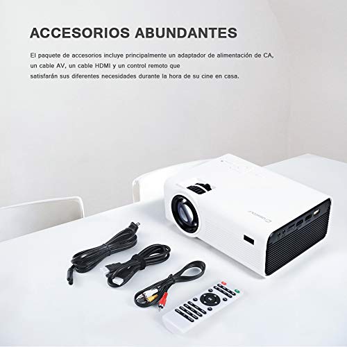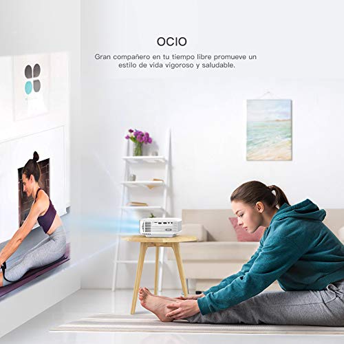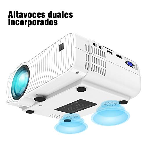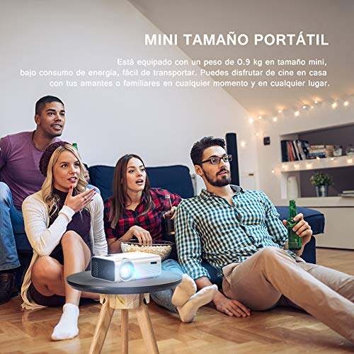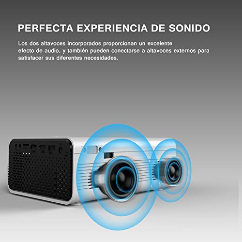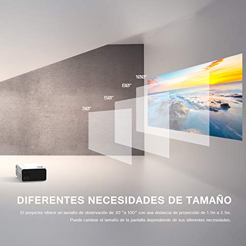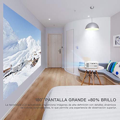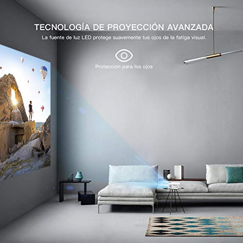 - 【 EL ÚNICO PROYECTOR IDEAL PARA CINE EN CASA 】Establezca ahora un Cine portátil en su casa para ver películas y series de TV, ver diapositivas de fotos y jugar video juegos. Este proyector portátil ofrece un desempeño impresionante de producto y le brinda una experiencia fantástica y hermosa en su gran pantalla de 170 pulgadas. El método más nuevo de iluminación uniforme mejorada que garantiza una experiencia visual óptima, pues no aparecerán áreas oscuras en el borde de la pantalla.