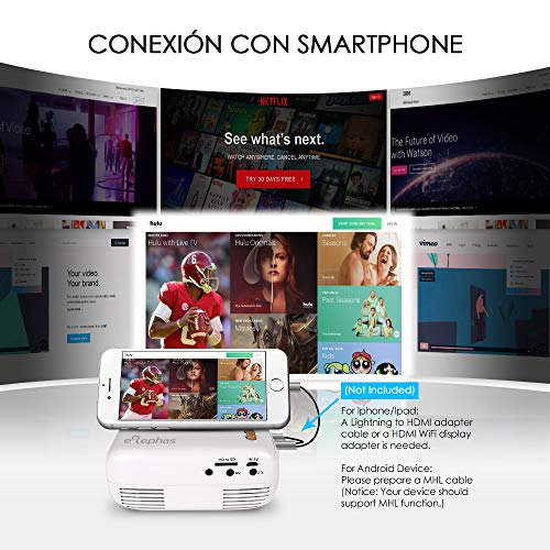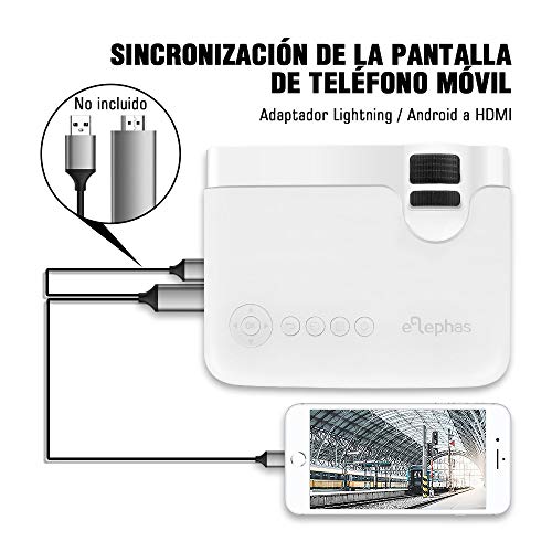 - ❤Sincronización de Pantalla ❤ puede conectar su teléfono inteligente al proyector ELEPHAS con un adaptador HDMI para realizar la sincronización de la pantalla(adaptador no incluido en el paquete). También es compatible con entradas USB / HD / SD / AV / VGA.