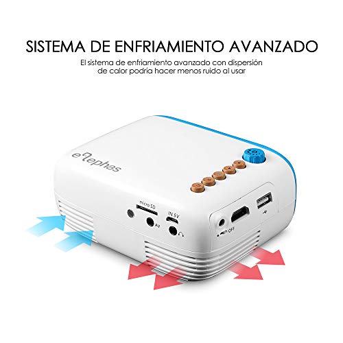 - ❤ Altavoces HIFI Incorporados ❤ el proyector portátil ELEPHAS está equipado con dos altavoces incorporados, que funcionan muy bien en una sala de tamaño normal. Para un mejor efecto de sonido, puede recurrir a un altavoz externo. Pero no se puede conectar con altavoces Bluetooth.