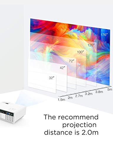 - 【GRAN EXPERIENCIA VISUAL】 El tamaño de la pantalla del proyector de DBPOWER alcanza hasta 200 pulgadas con una distancia de proyección de 1.5 a 5 m. Puede adaptar el tamaño de la pantalla a sus necesidades, sin embargo, la visualización óptima es a una distancia de 2-2.5 m. La resolución de contraste es de 2000: 1. El proyector Full-HD es de 1920x1080 píxeles, perfecto para usarse como sistema de cine en casa mientras libera el cansancio de sus ojos, incluso si ha estado mirando durante mucho ti