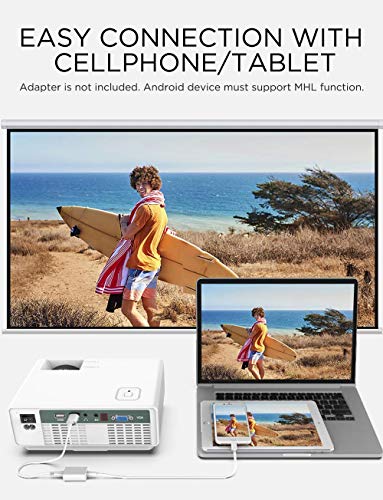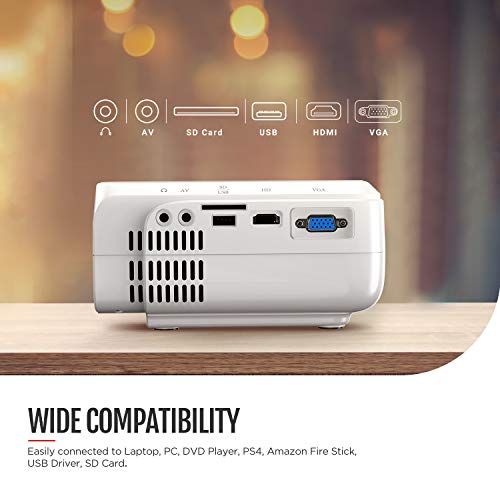 - 【 MÚLTIPLE ACCESABILIDAD MULTIMEDIA 】Este proyector compacto de video viene equipado con múltiples puertos para su facilidad de uso, incluyendo interfaces integradas HDMI, USB, Tarjeta TF, VGA y AV. Puede conectar este proyector directamente a un TV Stick, así como también a Juegos de Consola, PC, Teléfonos Inteligentes, Tabletas, Laptops, Reproductores de DVD, Tarjetas Micro SD y unidades USD Flash.