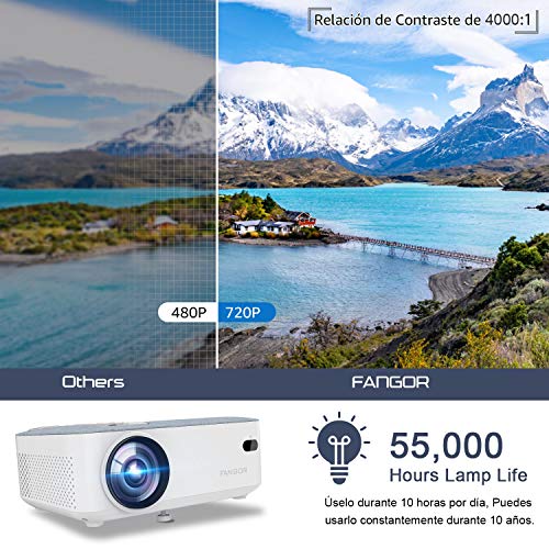 - ❤【LÁMPARA LED DE LARGA DURACIÓN】 FANGOR 720P nativo video proyector portátil tiene una pantalla LCD de cinco capas que permite una duración de la lámpara del proyector hasta un máximo de 55.000 horas. La fuente de luz LED protege perfectamente tus ojos y los de tu familia. Es sin duda la mejor opción para su entretenimiento en el cine en casa.