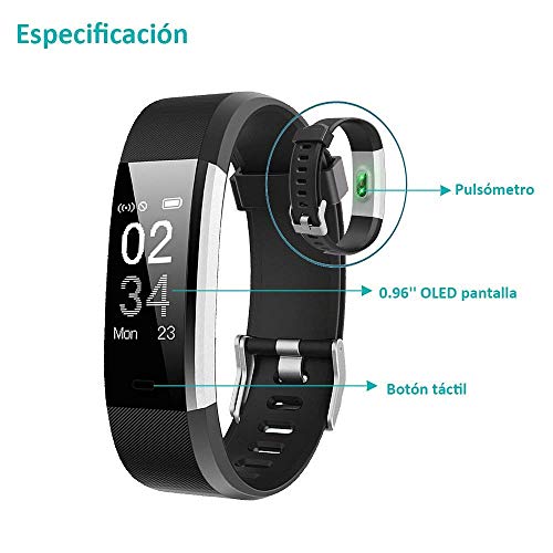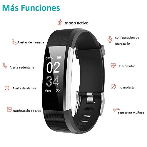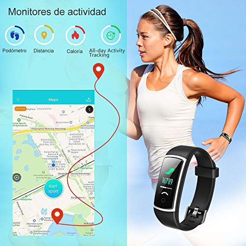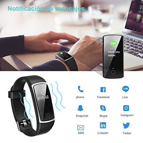 - 【 Notificaciones inteligentes 】Conecte el rastreador de aptitud con su teléfono inteligente, nunca se perderá una llamada y un mensaje. Vibrará para avisarle si su teléfono recibe una llamada telefónica, mensajes de texto SMS y mensajes SNS como Facebook, Twitter, WhatsApp, Linkedin, Messenger, etc. Simplemente conecte la pulsera a su teléfono a través de Bluetooth y establezca en la aplicaci.