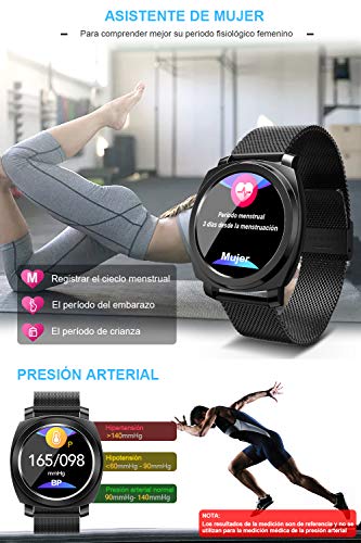 - 【Smartwatch Multifuncional】Disponibe con muchas funciones los siguientes:monitor del ritmo cardíaco, sueño y calorías, presión arterial, podómetro, cronómetro, control de cámara, alerta sedentaria, impermeable 67, notificaciones de SMS y llamada, Además tiene un función femenina, puede registrar datos del período de la menstruación, el embarazo preparado, el embarazo y la crianza. Los funciones para que abtengan un buen salud.
