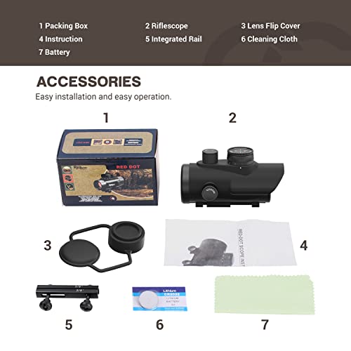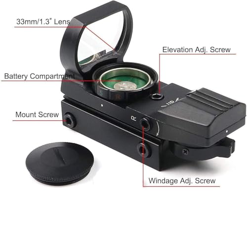 - Punto rojo caza con lente multi-revestida de 30mm mostrar imágenes más brillantes y claras, y un amplio campo de visión de(19m at 100m), adecuado para disparos rápidos de blancos en movimiento y normales.
