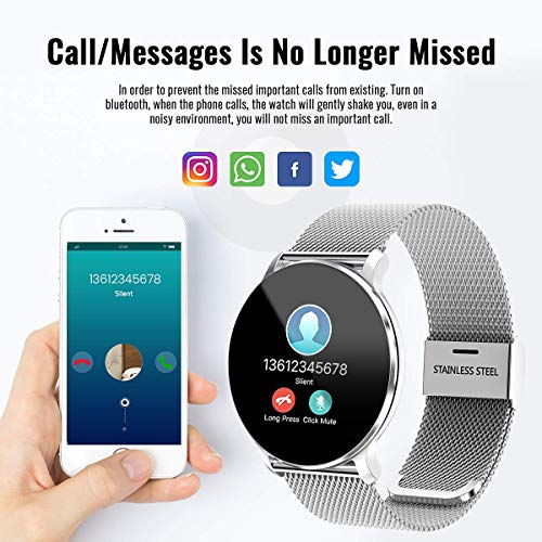 - 【 Notificaciones inteligentes 】Conecte el rastreador de aptitud con su teléfono inteligente, nunca se perderá una llamada y un mensaje. Vibrará para avisarle si su teléfono recibe una llamada telefónica, mensajes de texto SMS y mensajes SNS como Facebook, Twitter, WhatsApp, Linkedin, Messenger, etc. Simplemente conecte la pulsera a su teléfono a través de Bluetooth y establezca en la aplicaci.